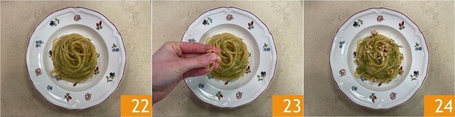 Emprate os espaguetes 22, depois finalize com as avelãs picadas 23 e o funcho selvagem. A massa com creme de alho-poró braseado, avelãs e funcho está pronta para ser servida 24!
