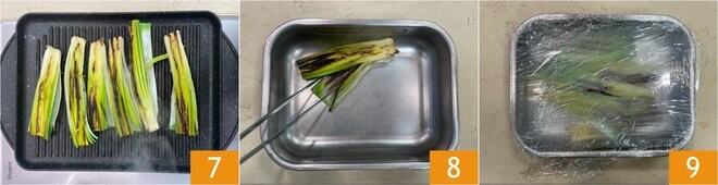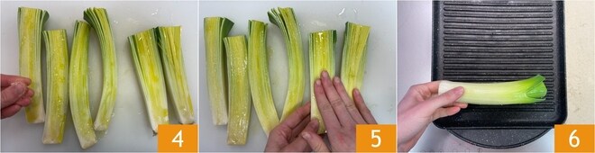 Deixe dourar bem os alhos-poró de ambos os lados 7, isso levará cerca de 10 minutos. Quando estiverem macios, transfira-os para uma assadeira 8, cubra com filme plástico e deixe descansar por 10 minutos 9; assim, eles continuarão a amaciar com o próprio vapor.