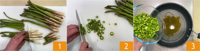 Para preparar a massa com creme de aspargos, stracciatella e bottarga, comece pela Como limpar os aspargos: elimine as extremidades mais duras 1, depois corte-os em rodelas regulares 2 reservando as pontas. Em uma frigideira, aqueça um fio de óleo e coloque os aspargos 3.