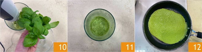 Adicione também as folhas de manjericão lavadas e secas 10, um fio de azeite de oliva e bata tudo com o mixer de imersão até obter um creme liso e sem grumos 11. Despeje o creme obtido na mesma frigideira usada para cozinhar os aspargos 12.