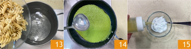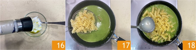 Enquanto isso, cozinhe os fusilloni em água fervente e salgada por dois terços do tempo indicado na embalagem 13. Despeje uma concha da água de cozimento da massa na frigideira com o creme de aspargos 14 e deixe em fogo bem baixo enquanto continua com o preparo. Coloque a stracciatella em uma tigela e tempere com um fio de azeite 15.