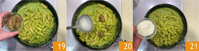 Adicione também o patê de azeitonas 19 e mais uma concha de água quente 20. Quando a massa estiver pronta, desligue o fogo e adicione o Parmigiano Reggiano DOP ralado 21.