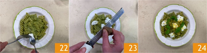 Sirva nos pratos decorando com pedaços de stracciatella 22 e bottarga ralada a gosto 23. A massa com creme de aspargos, stracciatella e bottarga está pronta para ser servida 24!