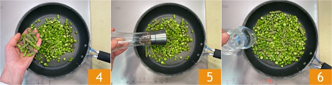 Adicione também as pontas 4, então salgue, apimente a gosto 5 e regue com um pouco de água 6.