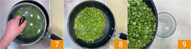 Cubra com a tampa 7 e deixe os aspargos refogarem por alguns minutos, o tempo necessário para amaciá-los 8. Transfira os aspargos para uma jarra alta, com sua água de cozimento 9.