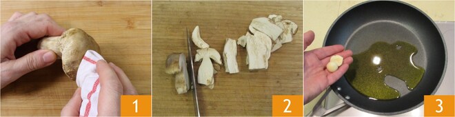 Para preparar a massa com creme de Parmesão e cogumelos porcini, a primeira coisa a fazer é limpar os cogumelos: raspe delicadamente o caule para remover a parte terrosa, depois elimine os resíduos com a ajuda de um pano úmido e de um pincel 1. Corte os cogumelos ao comprido em fatias de cerca de meio centímetro de espessura 2. Coloque uma panela com água no fogo para cozinhar a massa e aqueça uma frigideira com uma boa quantidade de óleo e 2 dentes de alho 3.