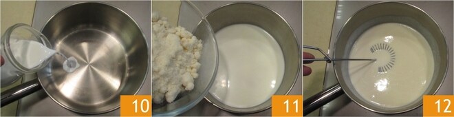 Enquanto isso, prepare o creme de Parmigiano Reggiano DOP: aqueça o leite em uma panela pequena 10, depois adicione o Parmigiano Reggiano DOP ralado 11 e uma pitada de pimenta. Mexa em fogo baixo até obter uma consistência homogênea 12.