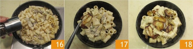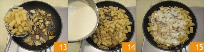 Escorra a massa al dente diretamente na frigideira com os cogumelos 13 e salteie tudo, depois adicione o creme de Parmigiano Reggiano DOP com o fogo desligado 14 e misture 15. Se necessário, você pode adicionar um pouco da água de cozimento da massa.