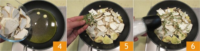 Adicione os porcini 4, depois tempere com tomilho 5, sal 6 e pimenta. Refogue em fogo médio-alto por 6-8 minutos, mexendo frequentemente para não queimá-los.