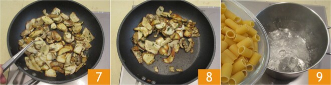 Uma vez cozidos, retire o alho 7 e reserve alguns cogumelos para decoração 8. Neste ponto, a água já terá fervido, então adicione sal e coloque as meias manicas 9.