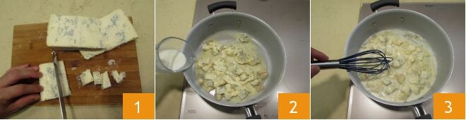 Para preparar a massa com gorgonzola gratinada no forno, primeiro cozinhe a massa al dente em uma panela com água salgada fervente. Pegue o gorgonzola, corte-o em tiras e depois em pedaços 1. Em uma frigideira, adicione o gorgonzola, junte o leite para diluir o queijo e torná-lo cremoso 2 e mexa com um batedor 3.