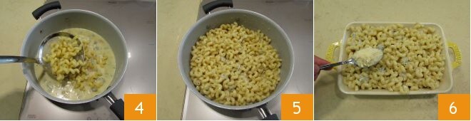 Cozinhe em fogo moderado por 2 ou 3 minutos, até obter um creme liso. Assim que a massa estiver pronta, escorra e transfira para a frigideira com o molho 4, misturando bem tudo 5. Coloque a massa em uma assadeira retangular de 26x18 cm e polvilhe com bastante Grana 6.
