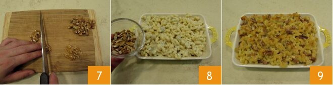 Pique grosseiramente as nozes 7 e distribua-as sobre a massa 8. Cozinhe por 3-4 minutos no forno em modo grill 9. Sua massa com gorgonzola gratinada no forno está pronta para ser servida!