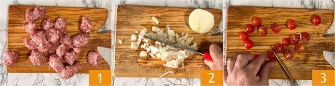 Para preparar a massa com linguiça, primeiro coloque uma panela com água para ferver, salgue e cozinhe a massa. Passe à preparação dos ingredientes: retire a pele da linguiça e corte-a em pedaços 1. Descasque a cebola e pique-a finamente 2. Por fim, lave os tomatinhos e corte-os ao meio 3.