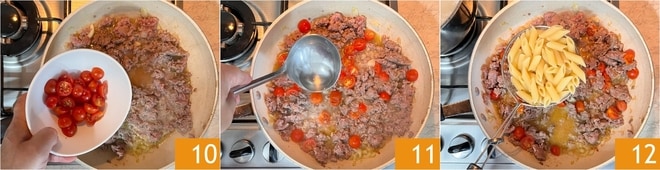 Adicione também os tomatinhos 10 e uma concha da água de cozimento da massa 11. Cozinhe por mais alguns minutos, depois desligue o fogo. Escorra a massa al dente e transfira-a diretamente para a panela 12.