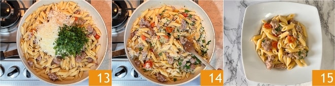 Complete com o Pecorino ralado e a salsa picada 13, depois misture rapidamente e bem para incorporar tudo 14. Sirva sua massa com linguiça bem quente 15!