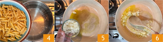 Quando a água ferver, adicione a massa e cozinhe até ficar al dente 4. Enquanto isso, aqueça o óleo em uma frigideira, depois adicione o alho e a cebola 5 e refogue por alguns minutos 6.