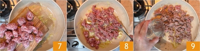 Adicione a linguiça 7 e desfaça-a com um garfo 8. Quando estiver bem dourada, adicione sal, pimenta e deglace com o vinho branco 9, cuidando para deixá-lo evaporar completamente.