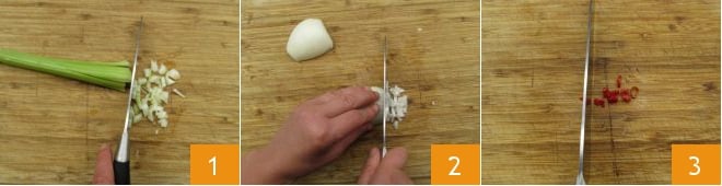 Para preparar o macarrão com molho de bacon defumado, comece limpando e cortando os ingredientes para o cozimento: pique finamente o aipo 1 e a cebola 2. Depois, triture também a pimenta, removendo as sementes para que fique menos picante 3.
