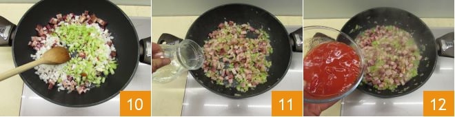 Deixe cozinhar por cerca de dez minutos, mexendo de vez em quando, assim os vegetais ficarão amolecidos e a carne dourada 10. Adicione o vinho e espere até que o álcool evapore completamente 11, depois adicione os tomates pelados 12.