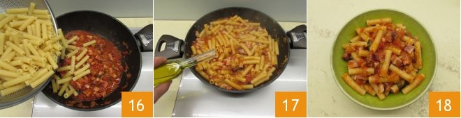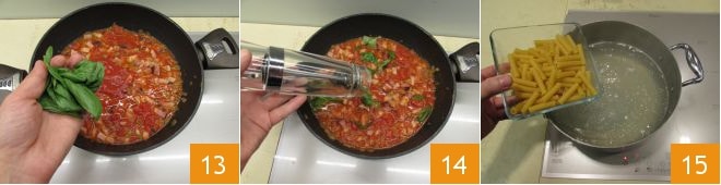 Rasgue o manjericão à mão 13 e ajuste o sal e a pimenta 14. Cozinhe o molho por cerca de vinte minutos ou até que esteja suficientemente seco ou tenha alcançado a consistência desejada. Enquanto isso, cozinhe os sedanini rigati em água fervente e salgada 15.