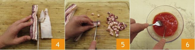 Retire a pele 4 e corte o bacon defumado em pedacinhos 5. Finalmente, pique os tomates pelados 6 e vá para o fogão. Coloque uma panela com bastante água para ferver para cozinhar o macarrão.