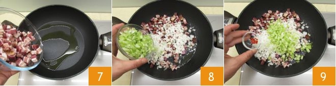 Aqueça um fio de óleo em uma panela e, em fogo baixo, doure o bacon 7 com a cebola, o aipo 8 e a pimenta 9.