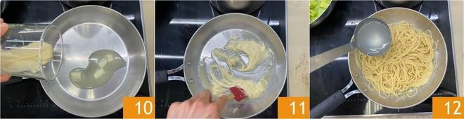 Em outra frigideira, coloque a manteiga restante e deixe derreter em fogo baixo, depois adicione o purê de pera 10 e misture 11. Escorra a massa al dente e transfira diretamente para a frigideira, adicionando um pouco da água do cozimento 12.