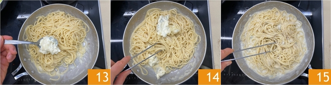 Sautée a massa, depois adicione quase todo o gorgonzola 13. Misture bem com o fogo apagado 14 até que esteja derretido 15 e a massa esteja bem incorporada.