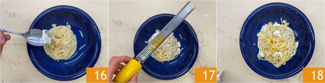 Emprate, decore com os cubos de pera, alguns pedaços de gorgonzola 16 e raspas de laranja 17. Sirva imediatamente sua massa com pera e gorgonzola 18!