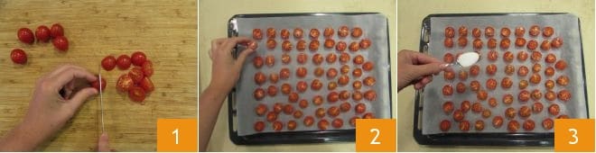 Para preparar a massa com pesto de amêndoas e tomatinhos confit, a primeira coisa a fazer é cuidar destes últimos. Lave-os, corte-os ao meio 1 e disponha-os em uma assadeira forrada com papel manteiga, com a parte das sementes voltada para você 2. Polvilhe com açúcar 3, salgue