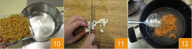 Cozinhe a massa pelo tempo indicado na embalagem 10 e, enquanto isso, corte o queijo fresco em cubinhos 11. Em seguida, transfira o pesto para outra panela e dilua-o com uma concha da água de cozimento 12;