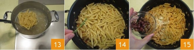 assim que a massa estiver al dente, escorra-a 13 e transfira-a para a panela. Adicione algumas folhinhas de tomilho 14, as azeitonas taggiasche 15 e misture tudo. Você pode, se desejar, temperar com mais Parmesão para tornar a massa ainda mais saborosa e convidativa.