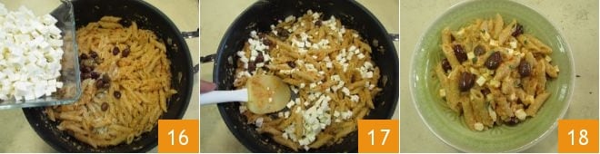 Adicione os cubinhos de queijo fresco 16, misture mais uma vez 17 e sirva sua massa com pesto de tomatinhos e amêndoas 18.