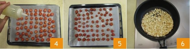 e regue tudo com um fio de azeite 4. Asse em forno ventilado pré-aquecido a 120°C por cerca de 2 horas, depois retire do forno 5 e deixe esfriar 5. Enquanto isso, toste também as amêndoas em fogo baixo por cerca de 4 minutos até que fiquem bem douradas 6; depois coloque no fogo uma panela com água salgada a gosto, que servirá para cozinhar a massa.