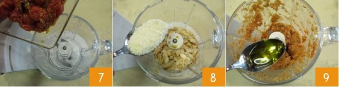 Assim que os tomatinhos estiverem frios, transfira-os para o copo de um mixer 7, adicione as amêndoas, o Parmesão ralado 8 e bata tudo. Em seguida, adicione o azeite 9, uma pitada de pimenta e bata novamente. Assim que obter uma mistura homogênea, reserve o seu pesto de tomatinhos.