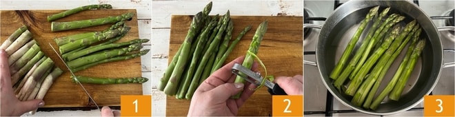 Para preparar a massa com pesto de aspargos e speck, comece pela preparação do pesto de aspargos: elimine as extremidades mais lenhosas 1 e descasque a parte restante do caule 2. No total, você vai precisar de cerca de 220 g de aspargos limpos. Escalde os aspargos em água salgada por cerca de 10 minutos 3.