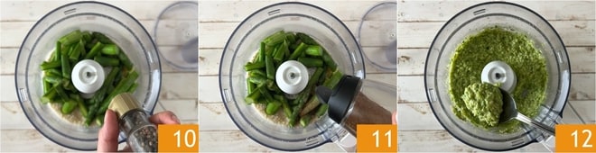 Tempere com sal, pimenta 10 e noz-moscada 11 e bata pulsando até obter um pesto com uma consistência rústica e cremosa 12.