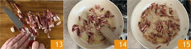 Agora corte o speck em tiras 13 e doure-o em uma frigideira com um fio de óleo quente 14 até ficar crocante 15. Enquanto isso, coloque uma panela de água para ferver para cozinhar a massa.