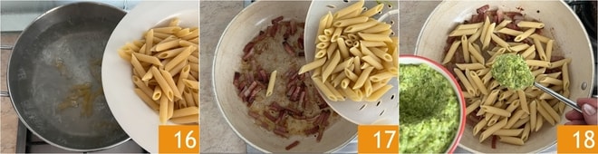 Quando a água estiver fervendo, adicione sal e coloque a massa 16. Escorra a massa al dente, reservando um pouco da água de cozimento, e transfira-a para a frigideira com o speck 17, depois adicione o pesto de aspargos 18.