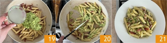Adicione algumas colheres da água de cozimento 19 e misture bem para integrar a massa ao molho 20. Sua massa com pesto de aspargos e speck está pronta para ser servida 21!