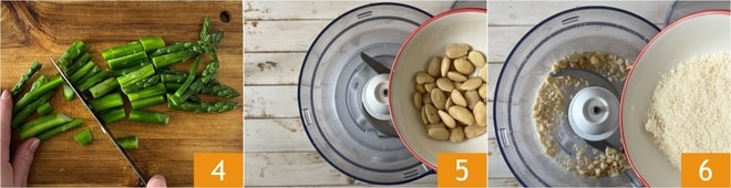 Escorra os aspargos, seque-os com um pano e corte-os em pedaços 4. Coloque as amêndoas em um mixer 5 e triture-as grosseiramente, depois adicione o Parmigiano Reggiano DOP e o Pecorino ralados 6 e bata novamente por mais alguns instantes.