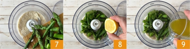 Adicione os aspargos 7 junto com algumas gotas de suco de limão 8 e o óleo 9.