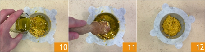 Adicione as flores de abobrinha no pilão 7 e esmague delicadamente até obter uma mistura homogênea 8. Adicione 50 g de Parmesão ralado 9 e continue a trabalhar o pesto, misturando bem com o pilão.