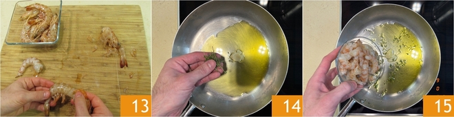 Enquanto isso, limpe os camarões removendo a carapaça 13. Prepare o refogado: em uma frigideira, aqueça um fio de azeite de oliva extra virgem e um dente de alho com algumas folhinhas de tomilho 14. Deixe fritar levemente até o alho ficar dourado. Nesse ponto, adicione os camarões 15.