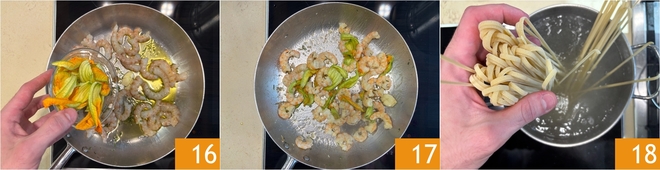 Acrescente também os 20 g de flores de abobrinha 16, sal, pimenta e salteie por 3 minutos em fogo alto 17. Leve uma panela com água salgada para ferver e cozinhe o macarrão al dente 18.