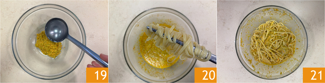 Afine o pesto com uma concha da água de cozimento do macarrão 19 e escorra o macarrão al dente 20. Misture bem para temperar o macarrão de forma uniforme 21.