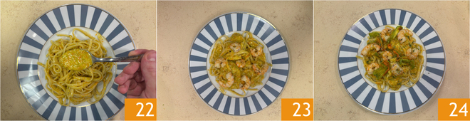 Emprate o macarrão adicionando o pesto 22, os camarões com as flores de abobrinha salteadas na frigideira 23 e algumas folhinhas de tomilho fresco. A massa com pesto de flores de abobrinha e camarões está pronta para ser servida 24!