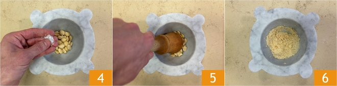 Adicione uma pitada de sal 4 e esmague com o pilão 5 até obter uma consistência fina 6.