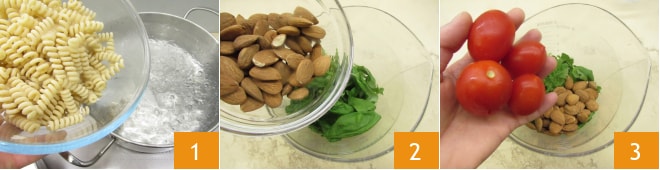Para preparar a massa com pesto de rúcula e atum, comece colocando a água para ferver para cozinhar os fusilli. Quando estiver fervendo, salgue e cozinhe a massa 1. Enquanto isso, prepare o pesto. No copo do mixer, coloque a rúcula, algumas folhas de manjericão, as amêndoas 2 e os tomates 3